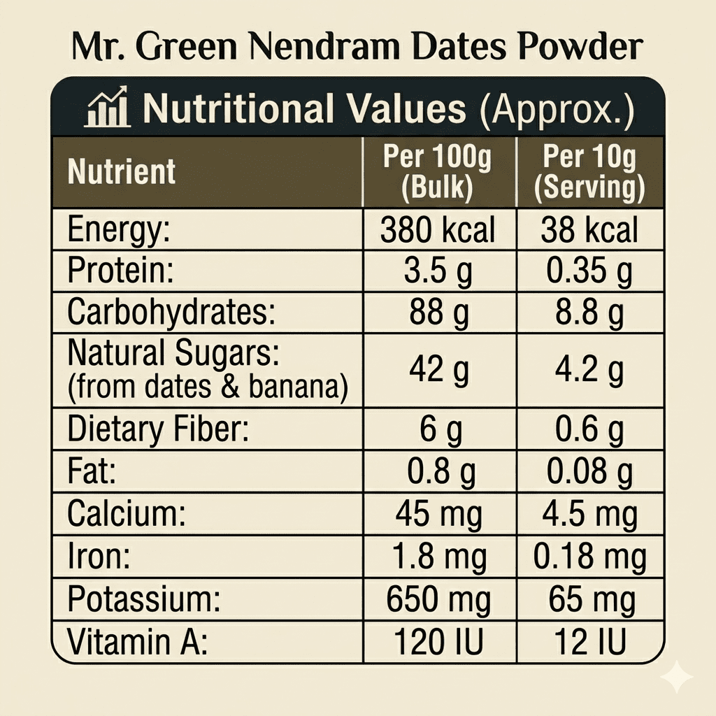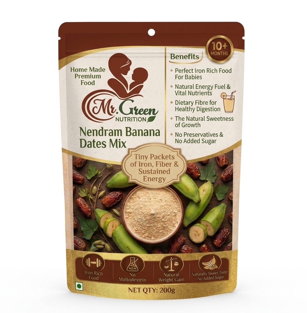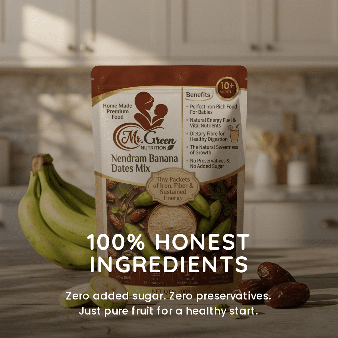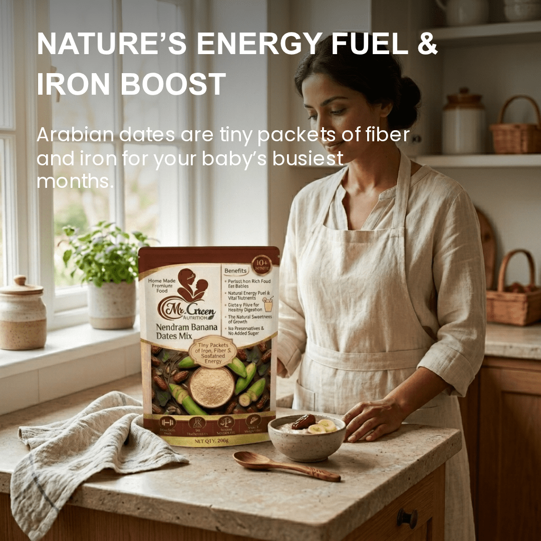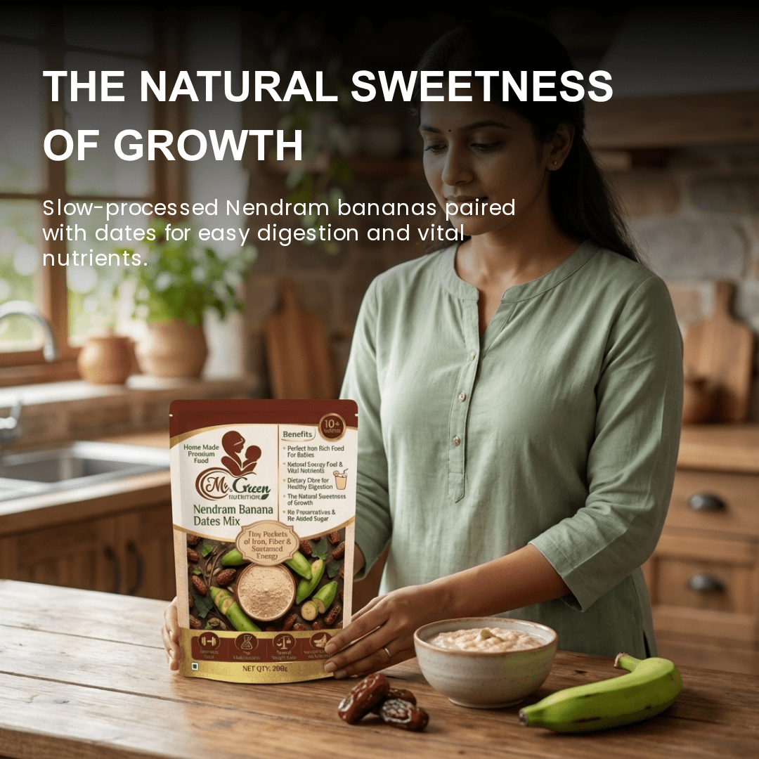 "The Natural Sweetness of Growth." Our Nendram Banana + Dates Powder is a 100% natural, Powerhouse meal designed for babies 10 months and older. Combining the gentle starch of Kerala’s finest Nendram bananas with the iron-rich energy of Arabian dates, it’s a ready-to-cook porridge that requires no added sugar. Pure, filling, and perfectly balanced for your baby’s first solid. Dates add fiber for healthy Digestion.