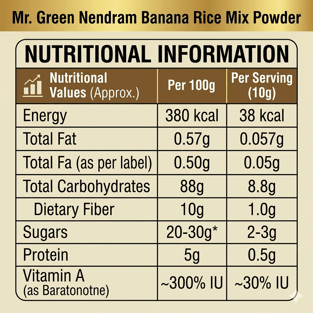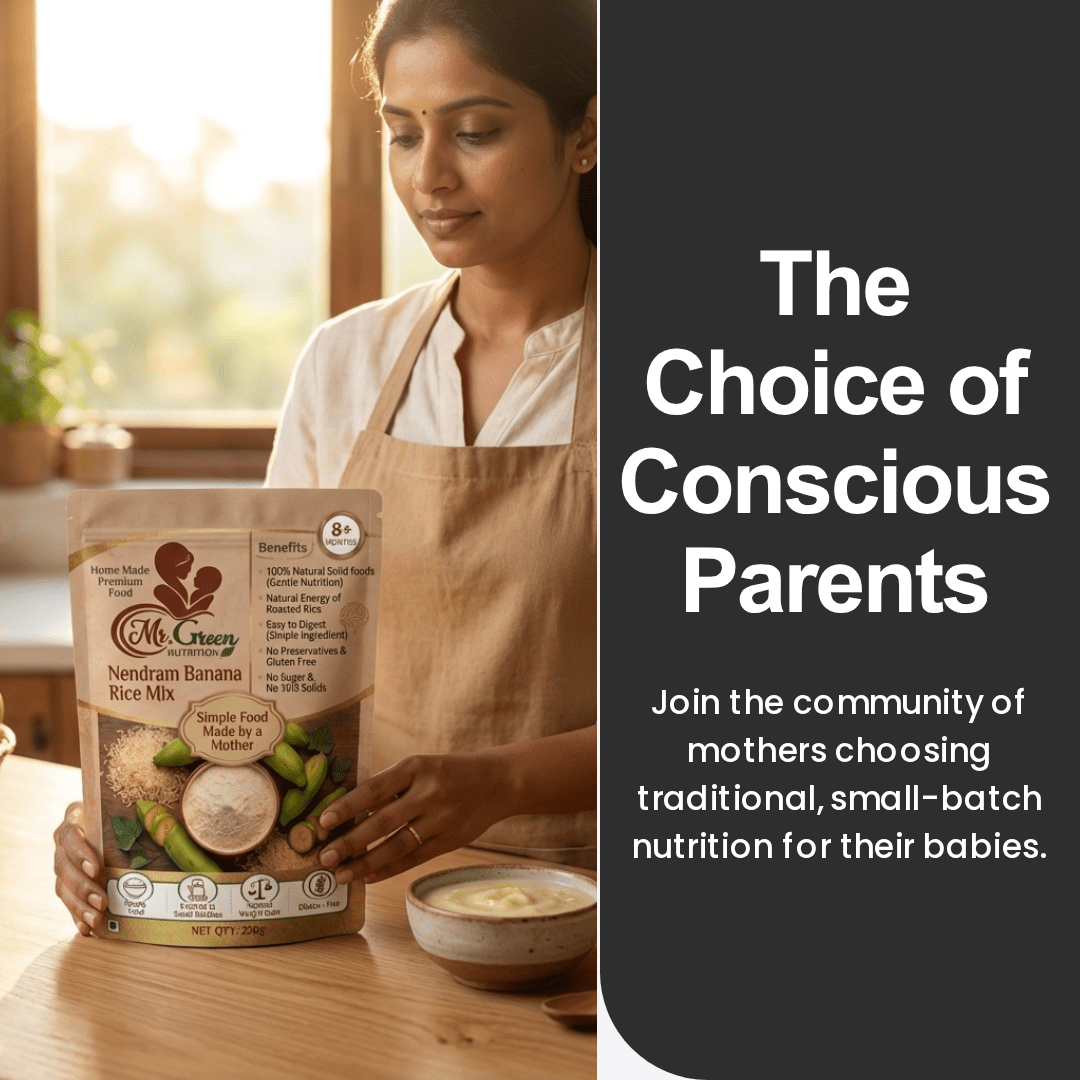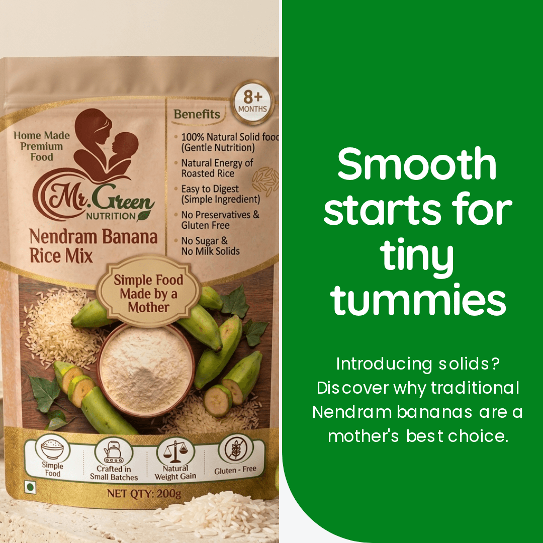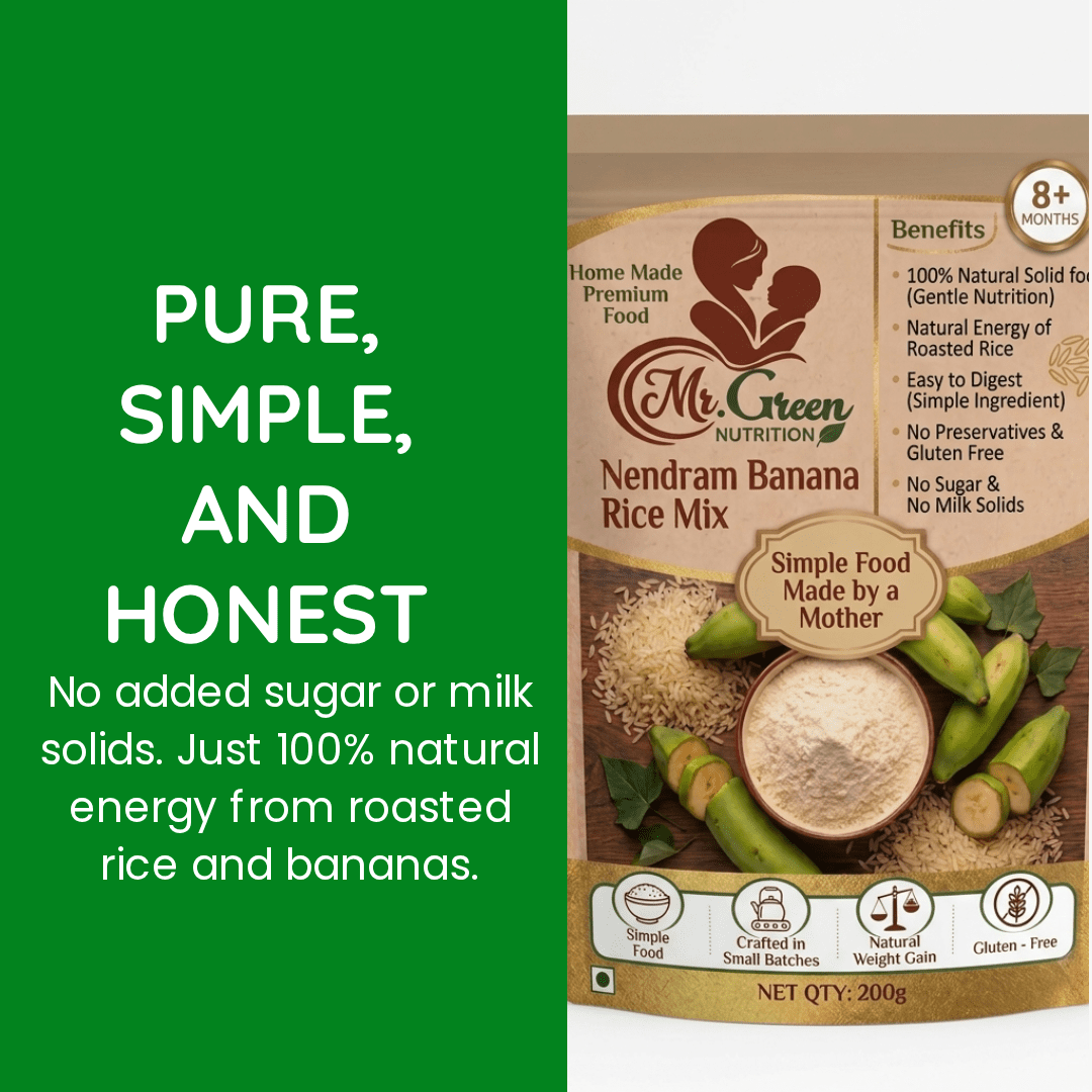 Crafted from fresh Nendram bananas, Mr.Green Powder supports healthy growth, easy digestion, and daily energy.Specially prepared for babies 6+ months — simple, wholesome nutrition for everyday meals.